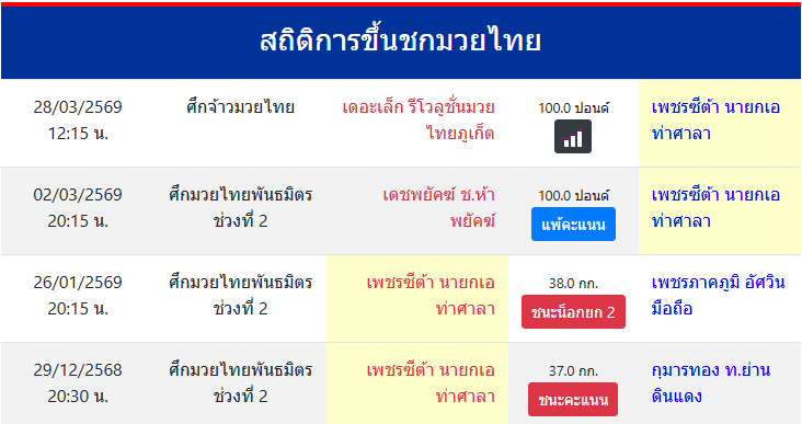เพชรซีต้า นายกเอท่าศาลา "เพชรซีต้า นายกเอท่าศาลา" ประเทศ 🇹🇭 ไทย ลีก Muay Thai 0 ชนะ 0 แพ้ 0 เสมอ 0 KO/TKO ประวัติและชีวประวัติ สถิติการขึ้นชกมวยไทยเพชรซีต้า นายกเอท่าศาลา ขึ้นชกล่าสุด2/3/2569(23 วัน)
