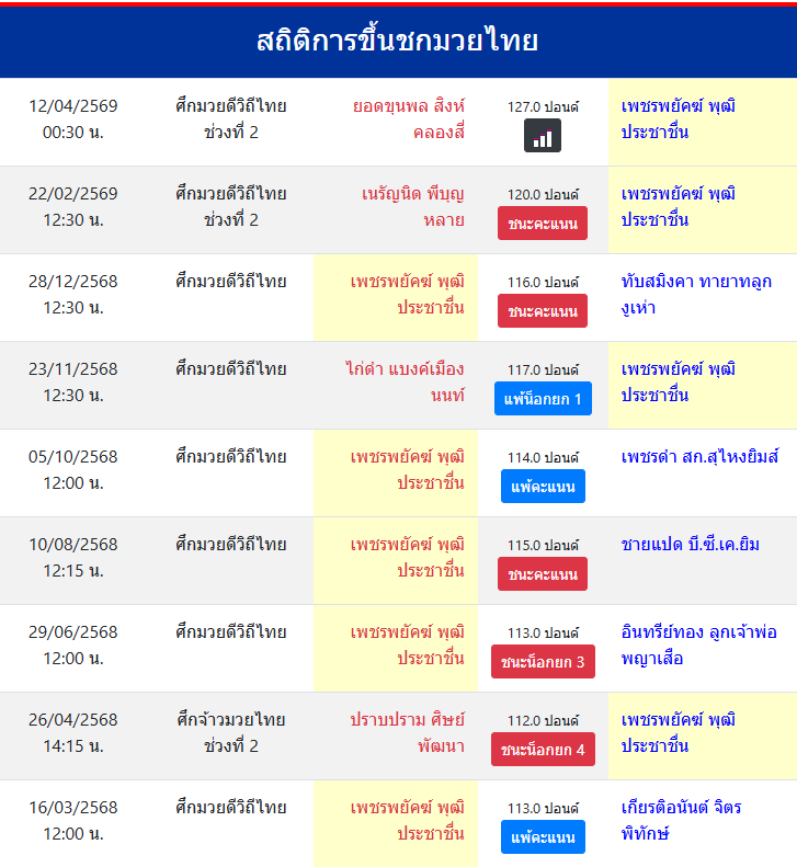 | ขึ้นชกล่าสุด | 22/2/2569 (1 เดือน 20 วัน) |