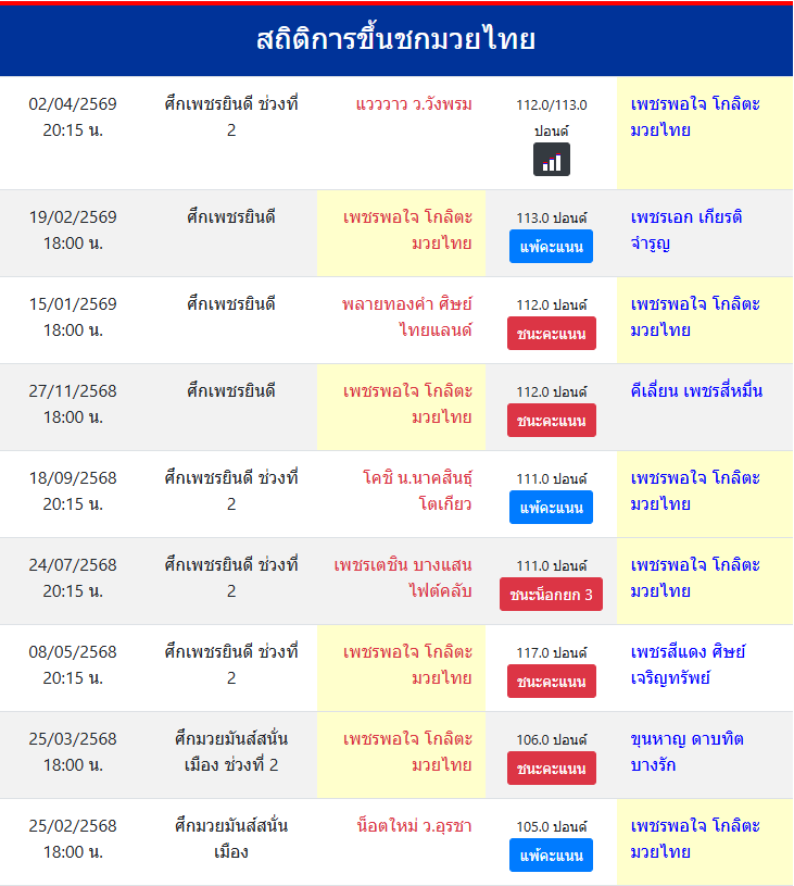 | ขึ้นชกล่าสุด | 19/2/2569 (1 เดือน 13 วัน) |