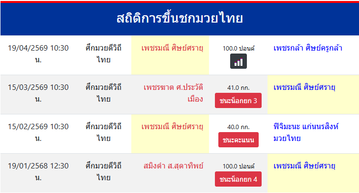 | ขึ้นชกล่าสุด | 15/3/2569 (1 เดือน 3 วัน) |