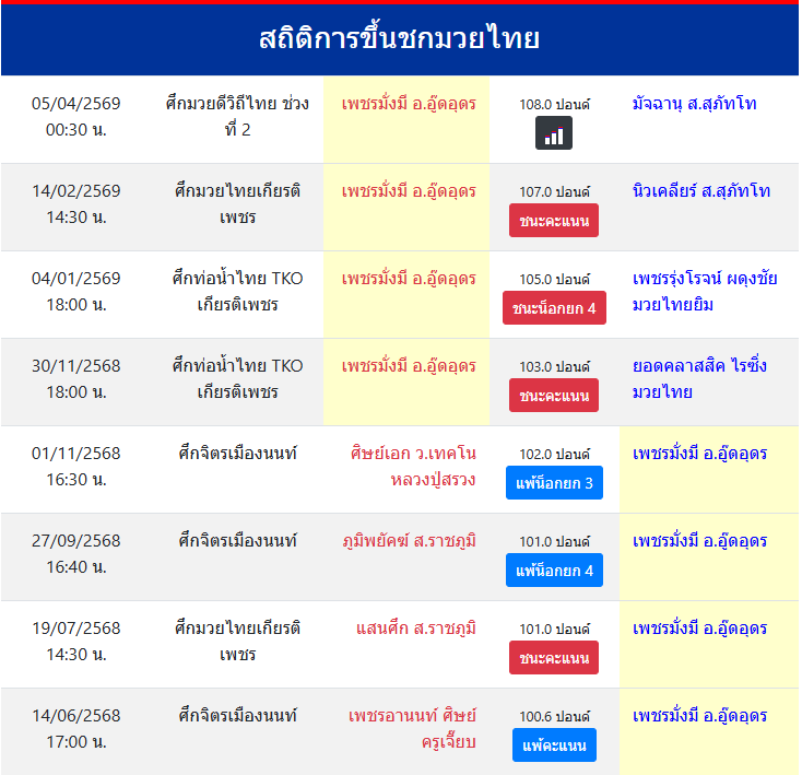 | ขึ้นชกล่าสุด | 14/2/2569 (1 เดือน 21 วัน) |