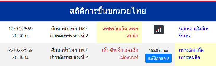 เพชรร้อยเอ็ด เพชรสมนึก "เพชรร้อยเอ็ด เพชรสมนึก" ประเทศ 🇹🇭 ไทย ลีก Muay Thai 0 ชนะ 0 แพ้ 0 เสมอ 0 KO/TKO ประวัติและชีวประวัติ สถิติการขึ้นชกมวยไทยเพชรร้อยเอ็ด เพชรสมนึก ขึ้นชกล่าสุด22/2/2569(1 เดือน 20 วัน)อายุ30 ปี