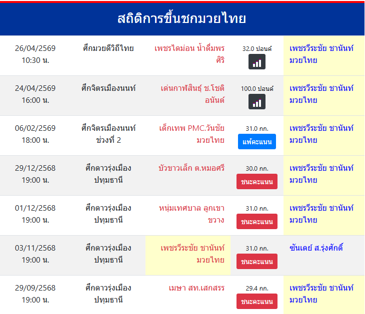 | ชกมาแล้ว | ≥ 50 ครั้ง |