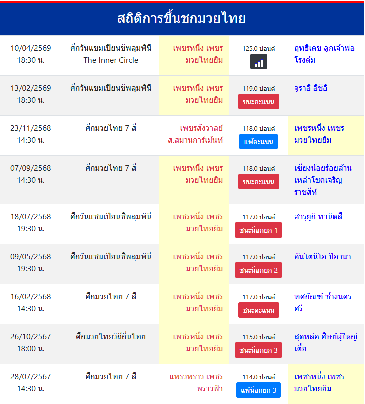 | ขึ้นชกล่าสุด | 13/2/2569 (1 เดือน 27 วัน) |