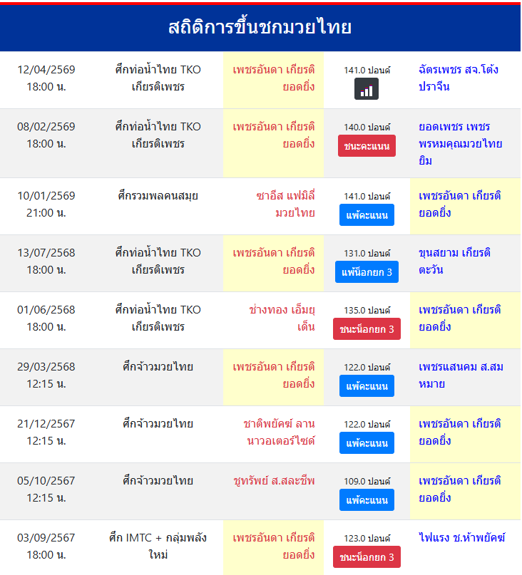 | ขึ้นชกล่าสุด | 8/2/2569 (2 เดือน 3 วัน) |