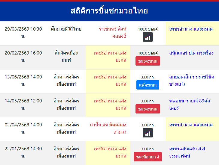 | ขึ้นชกล่าสุด | 20/2/2569 (1 เดือน 8 วัน) |