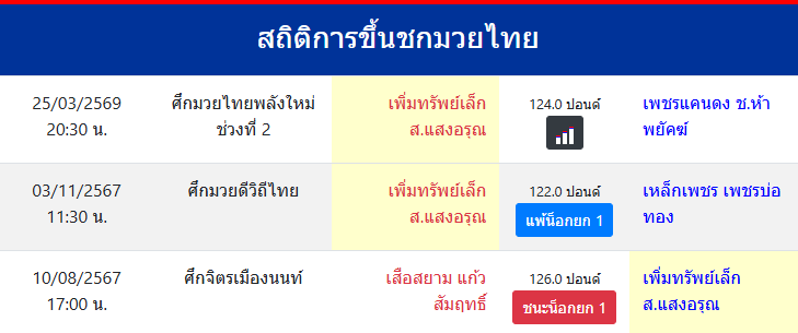 | ขึ้นชกล่าสุด | 3/11/2567 (1 ปี 4 เดือน 21 วัน) |