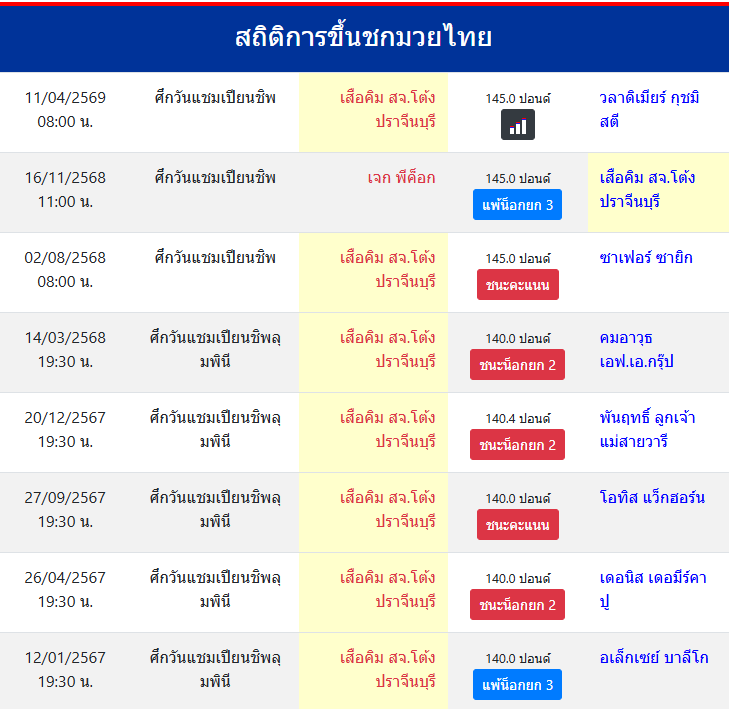 | ขึ้นชกล่าสุด | 16/11/2568 (4 เดือน 25 วัน) |