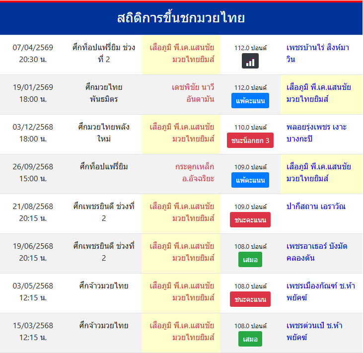 | ชกมาแล้ว | ≥ 100 ครั้ง |