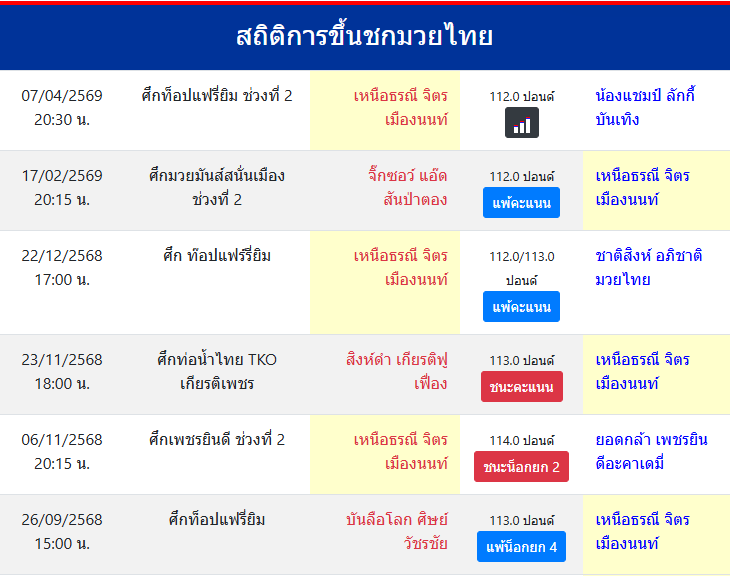 | ขึ้นชกล่าสุด | 17/2/2569 (1 เดือน 19 วัน) |