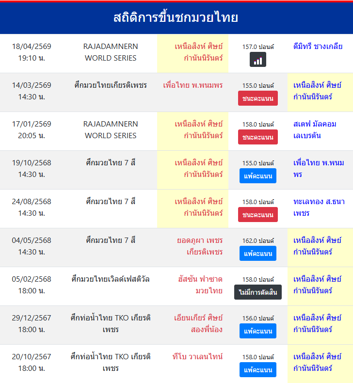 | ขึ้นชกล่าสุด | 14/3/2569 (1 เดือน 4 วัน) |
