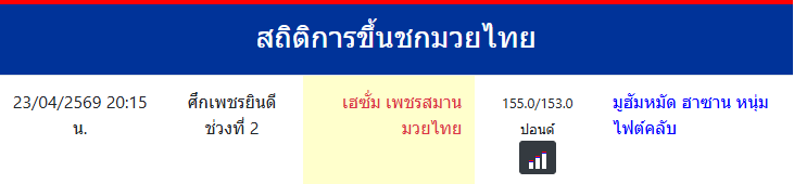 เฮซั่ม เพชรสมานมวยไทย "เฮซั่ม เพชรสมานมวยไทย" ประเทศ 🇹🇭 ไทย ลีก ONE Championship 0 ชนะ 0 แพ้ 0 เสมอ 0 KO/TKO ประวัติและชีวประวัติ สถิติการขึ้นชกมวยไทยเฮซั่ม เพชรสมานมวยไทย