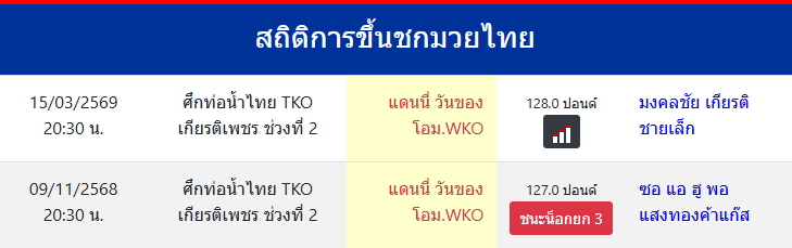 แดนนี่ วันของโอม.WKO "แดนนี่ วันของโอม.WKO" ประเทศ 🇹🇭 ไทย ลีก Muay Thai 0 ชนะ 0 แพ้ 0 เสมอ 0 KO/TKO ประวัติและชีวประวัติ สถิติการขึ้นชกมวยไทยแดนนี่ วันของโอม.WKO ขึ้นชกล่าสุด9/11/2568(4 เดือน 5 วัน)อายุ25 ปี