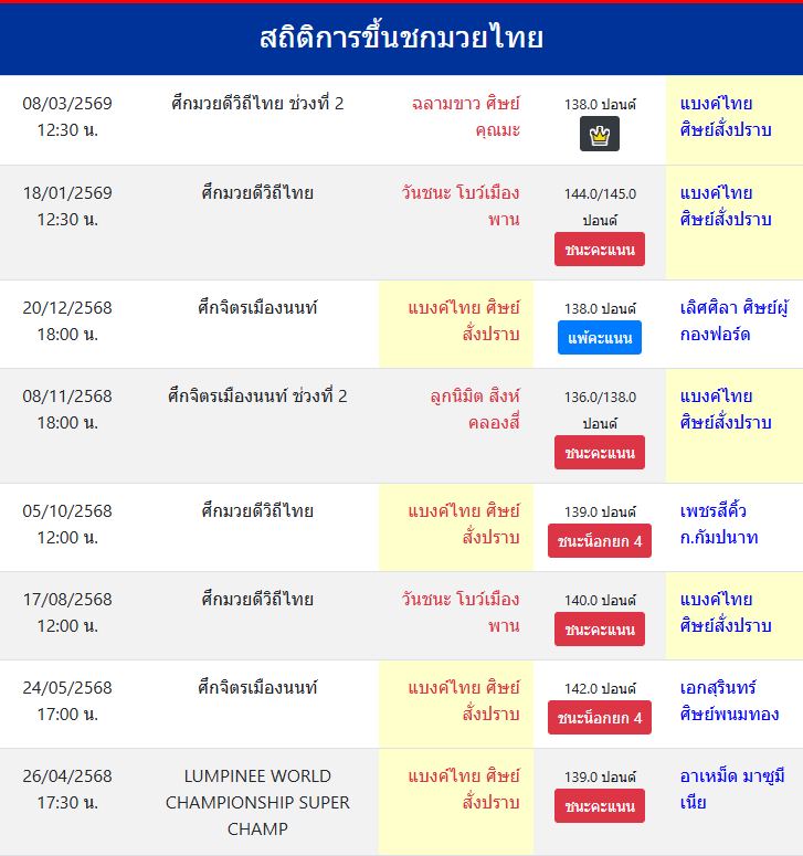 | ขึ้นชกล่าสุด | 3/2/2569 (1 เดือน 4 วัน) |