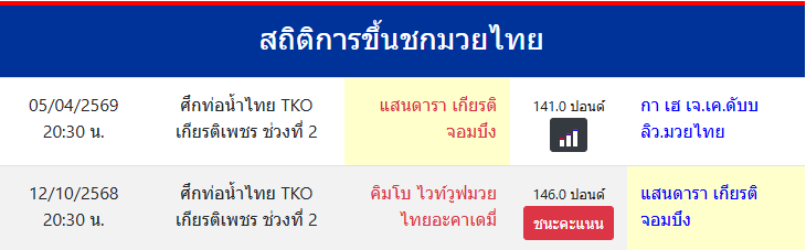 แสนดารา เกียรติจอมบึง "แสนดารา เกียรติจอมบึง" ประเทศ 🇹🇭 ไทย ลีก Muay Thai 0 ชนะ 0 แพ้ 0 เสมอ 0 KO/TKO ประวัติและชีวประวัติ สถิติการขึ้นชกมวยไทยแสนดารา เกียรติจอมบึง ขึ้นชกล่าสุด12/10/2568(5 เดือน 23 วัน)อายุ17 ปี