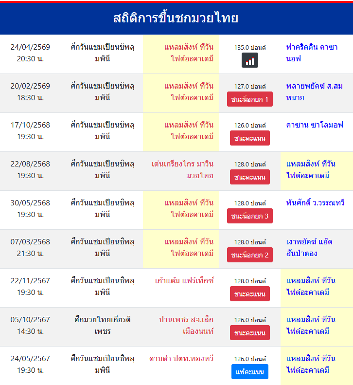 | ขึ้นชกล่าสุด | 20/2/2569 (2 เดือน 3 วัน) |