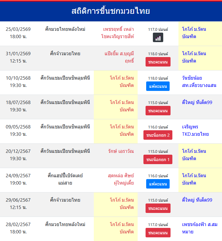 | ขึ้นชกล่าสุด | 31/1/2569 (1 เดือน 21 วัน) |