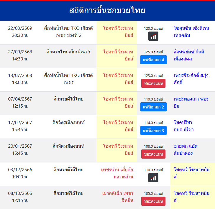 | ขึ้นชกล่าสุด | 27/9/2568 (5 เดือน 22 วัน) |