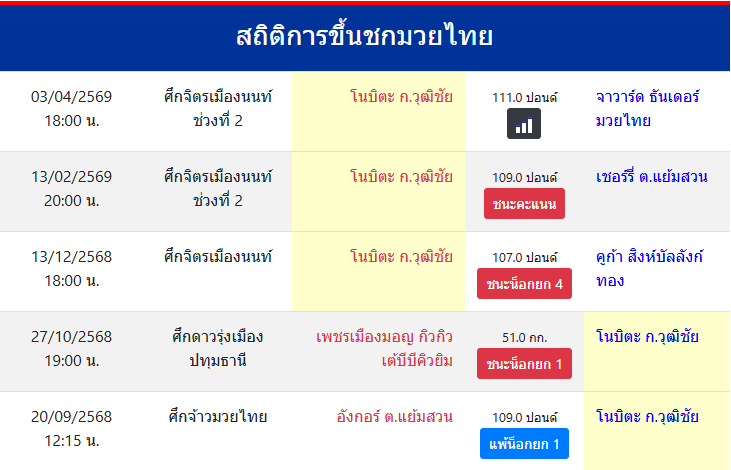 | ขึ้นชกล่าสุด | 13/2/2569 (1 เดือน 20 วัน) |