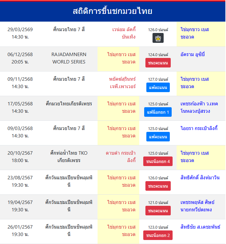 | ขึ้นชกล่าสุด | 24/1/2569 (2 เดือน 2 วัน) |