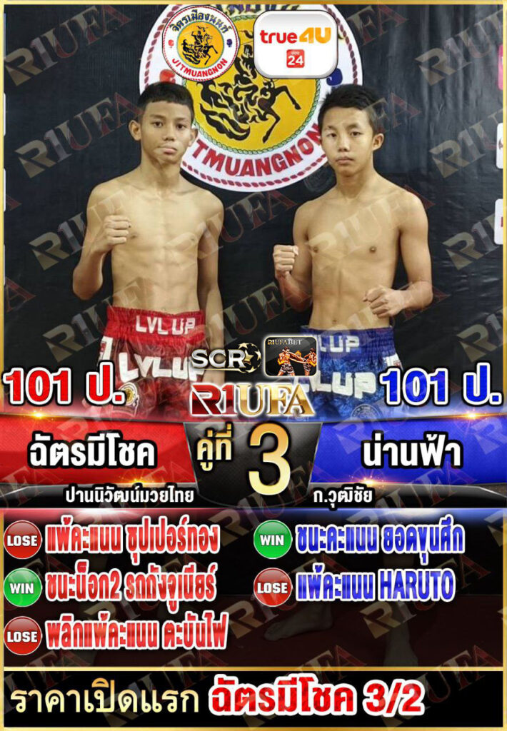 | คู่ชก | ฉัตรมีโชค ปานนิวัฒน์มวยไทย | น่านฟ้า ก.วุฒิชัย |