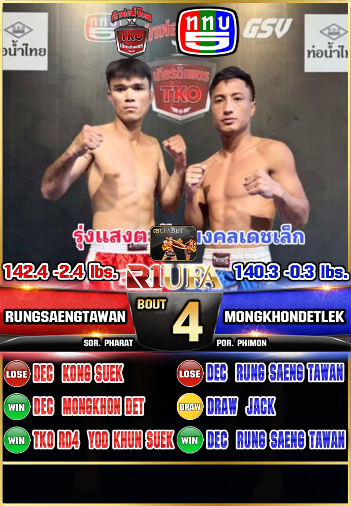 | คู่ชก | รุ่งแสงตะวัน ส.พาราษฎร์ | มงคลเดชเล็ก พ.พิมพ์อร |