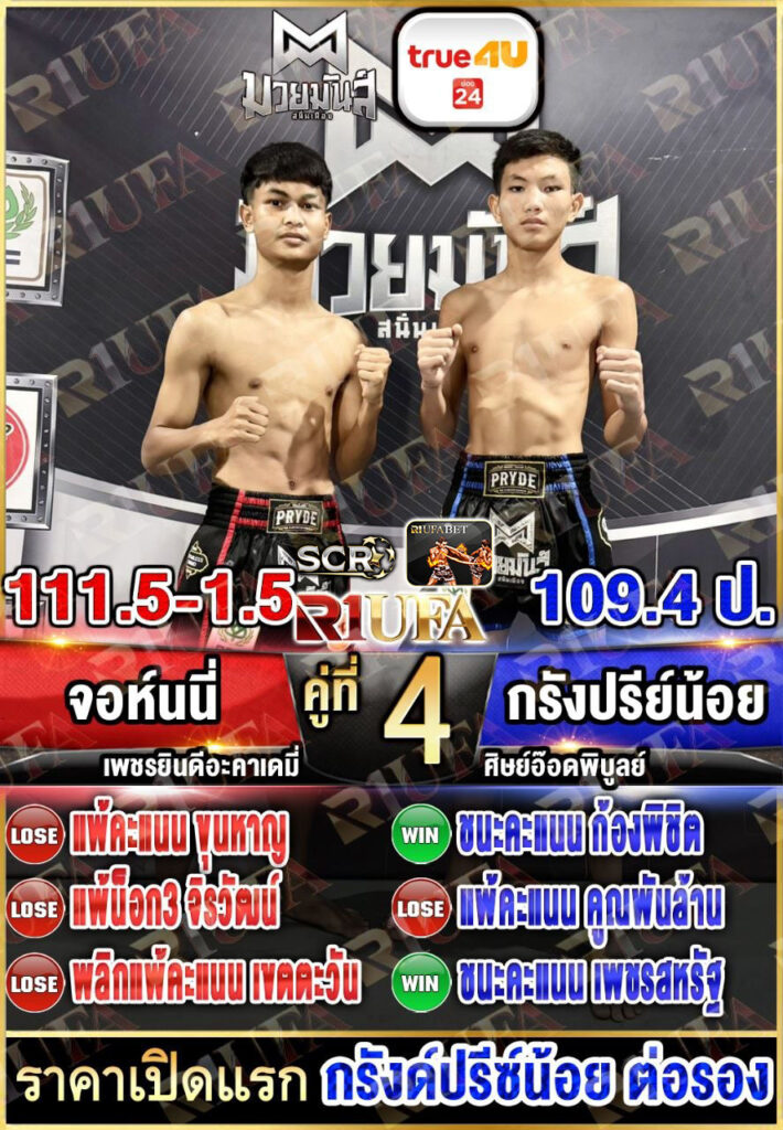 | คู่ชก | จอห์นนี่ เพชรยินดีอะคาเดมี่ | กรังปรีซ์น้อย ศิษย์อ๊อดพิบูล |