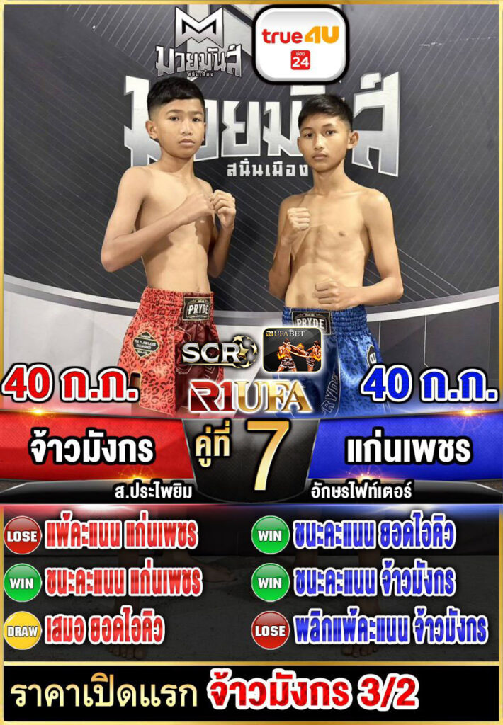 | คู่ชก | จ้าวมังกร ส.ประไพยิม | แก่นเพชร อักษรไฟท์เตอร์ |