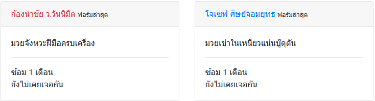 | ชกล่าสุด | 1 เดือน 4 วัน | 1 เดือน 18 วัน |