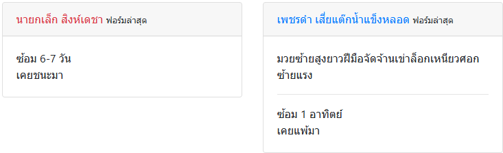| ชกล่าสุด | 2 เดือน 15 วัน | 1 เดือน 7 วัน |