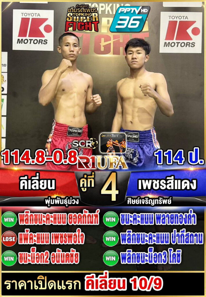 | คู่ชก | คีเลี่ยน พุ่มพันธุ์ม่วง | เพชรสีแดง ศิษย์เจริญทรัพย์ |