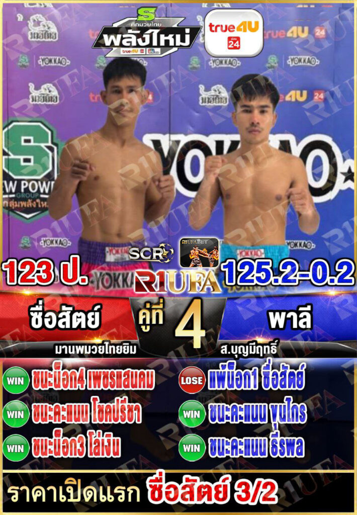 | คู่ชก | ซื่อสัตย์ มานพมวยไทยยิม | พาลี ส.บุญมีฤทธิ์ |