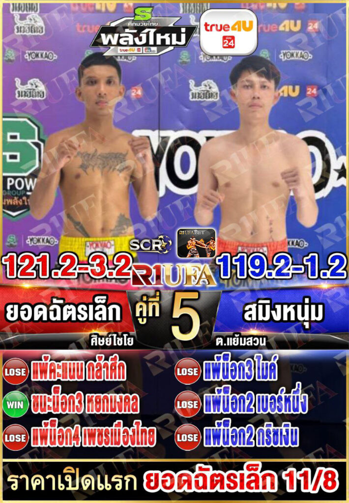 | คู่ชก | ยอดฉัตรเล็ก ศิษย์ไชโย | สมิงหนุ่ม ต.แย้มสวน |