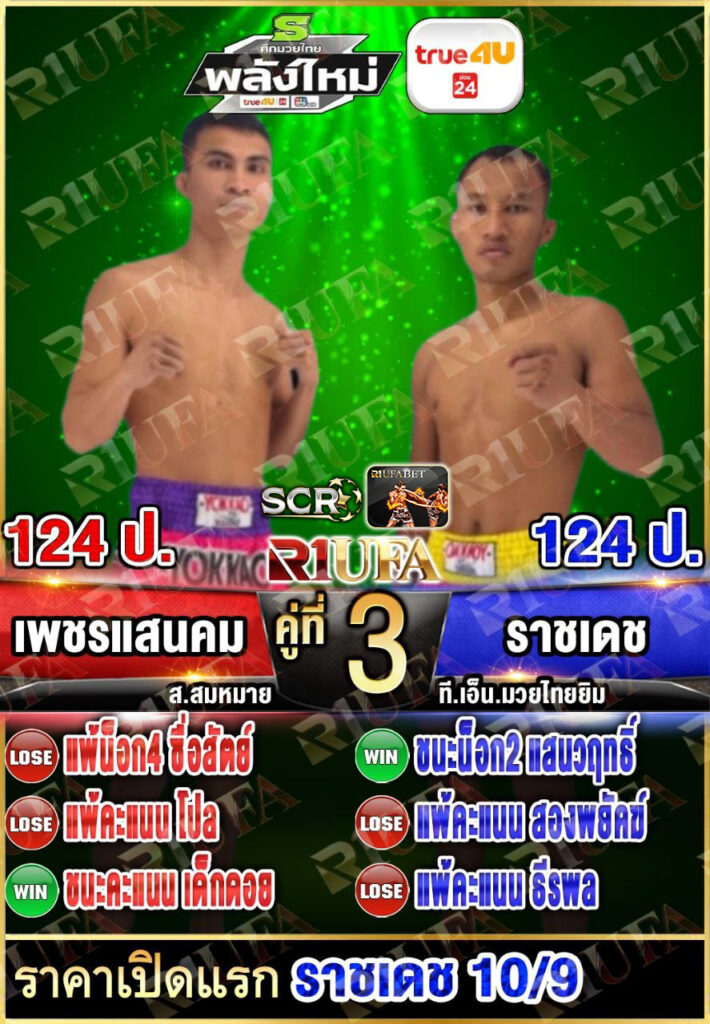 | คู่ชก | เพชรแสนคม ส.สมหมาย | ราชเดช ที.เอ็น.มวยไทยยิม |