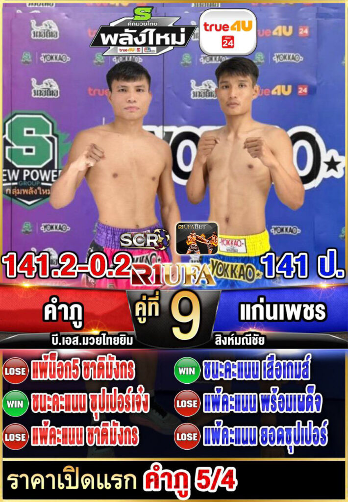 | คู่ชก | ลำน้ำโขง BS.มวยไทยยิม | แก่นเพชร สิงห์มณีชัย |