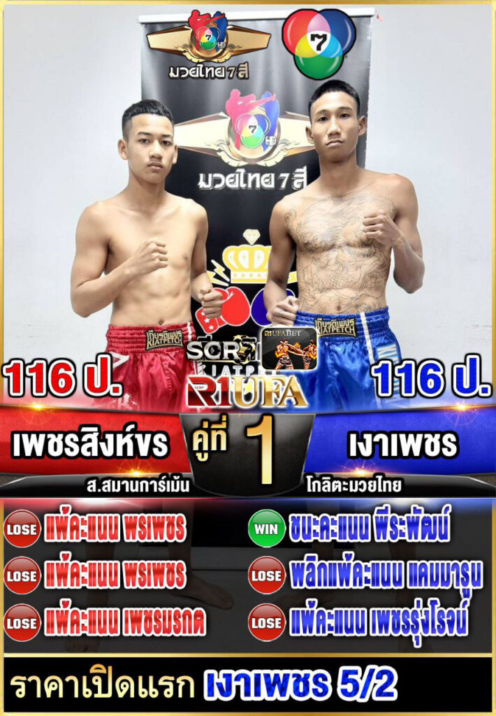 | คู่ชก | เพชรสิงห์ขร ส.สมานการ์เม้น | เงาเพชร โกลิตะมวยไทย |