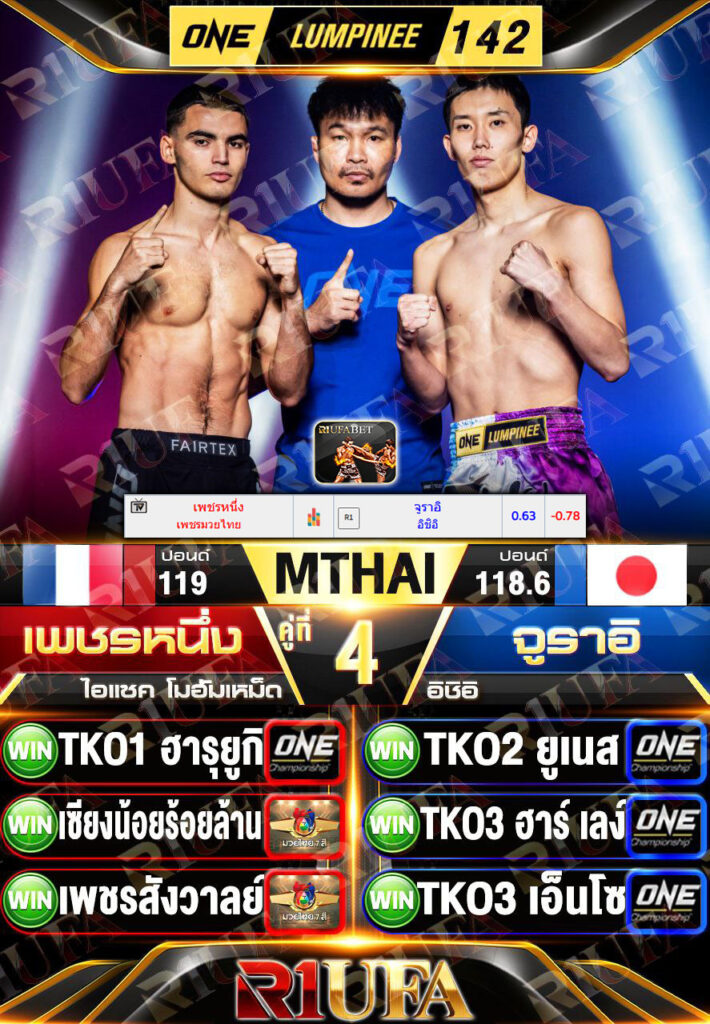 | คู่ชก | เพชรหนึ่ง เพชรมวยไทยยิม | จูราอิ อิชิอิ |