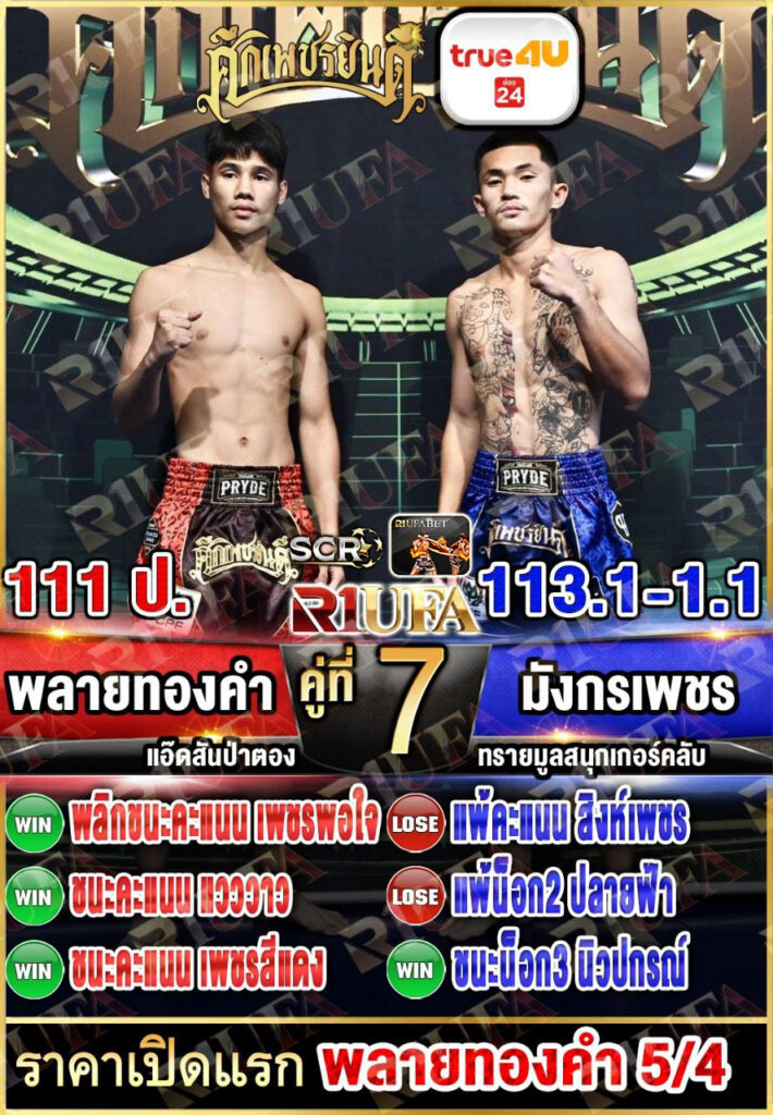 | คู่ชก | พลายทองคำ ศิษย์ไทยแลนด์ | มังกรเพชร ทรายมูลสนุ๊กเกอร์ |