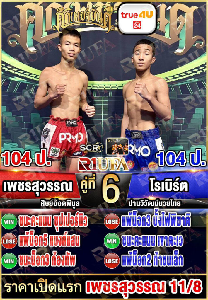 | คู่ชก | เพชรสุวรรณ ศิษย์อ๊อดพิบูล | โรเบิร์ต ปานนิวัฒน์มวยไทย |
