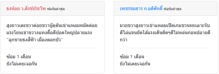| การต่อสู้ | สูงยาวเตะขวาต่อยขวาบู๊ดุดันเข่าแหลมหมัดต่อยแรงโยนเข่าขวางแทงตื้อดีปอดใหญ่ปลายแรง ”ลูกชายธงสีฟ้า เมืองดอกบัว” | มวยขวาสูงยาวเข่าแหลมเปิดเกมชวนทะเลาะจับตีไล่แขนยัดใส้แรงเดินติดๆดีไม่หล่นก่อนปลายดีกว่า |