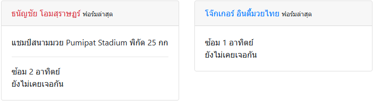| การต่อสู้ | แชมป์สนามมวย Pumipat Stadium พิกัด 25 กก | – |
